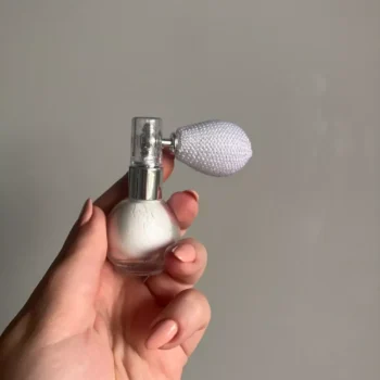 This product is GREAT! It offers a soft, white, sparkly shine that can be built upon. It comes in a charming, old-fashioned squeeze puff bottle that adds to its allure.